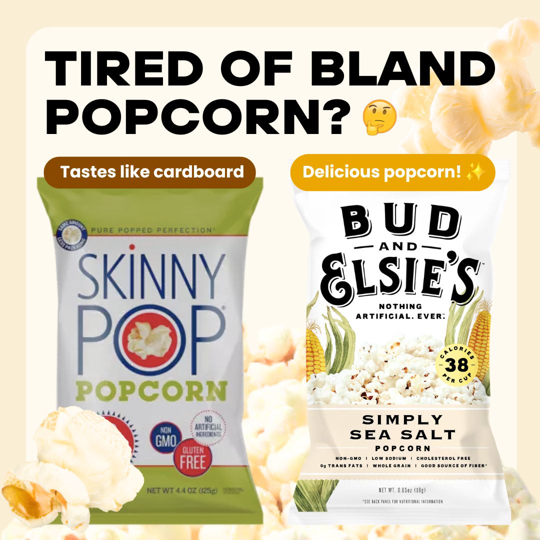 Summary: You can now have delicious popcorn, without all the sugar, artificial sweeteners, and added junk! Bud & Elsie's popcorn is all natural and popping with flavor! Keep reading to learn more about why Bud & Elsie's is better than SkinnyPop!